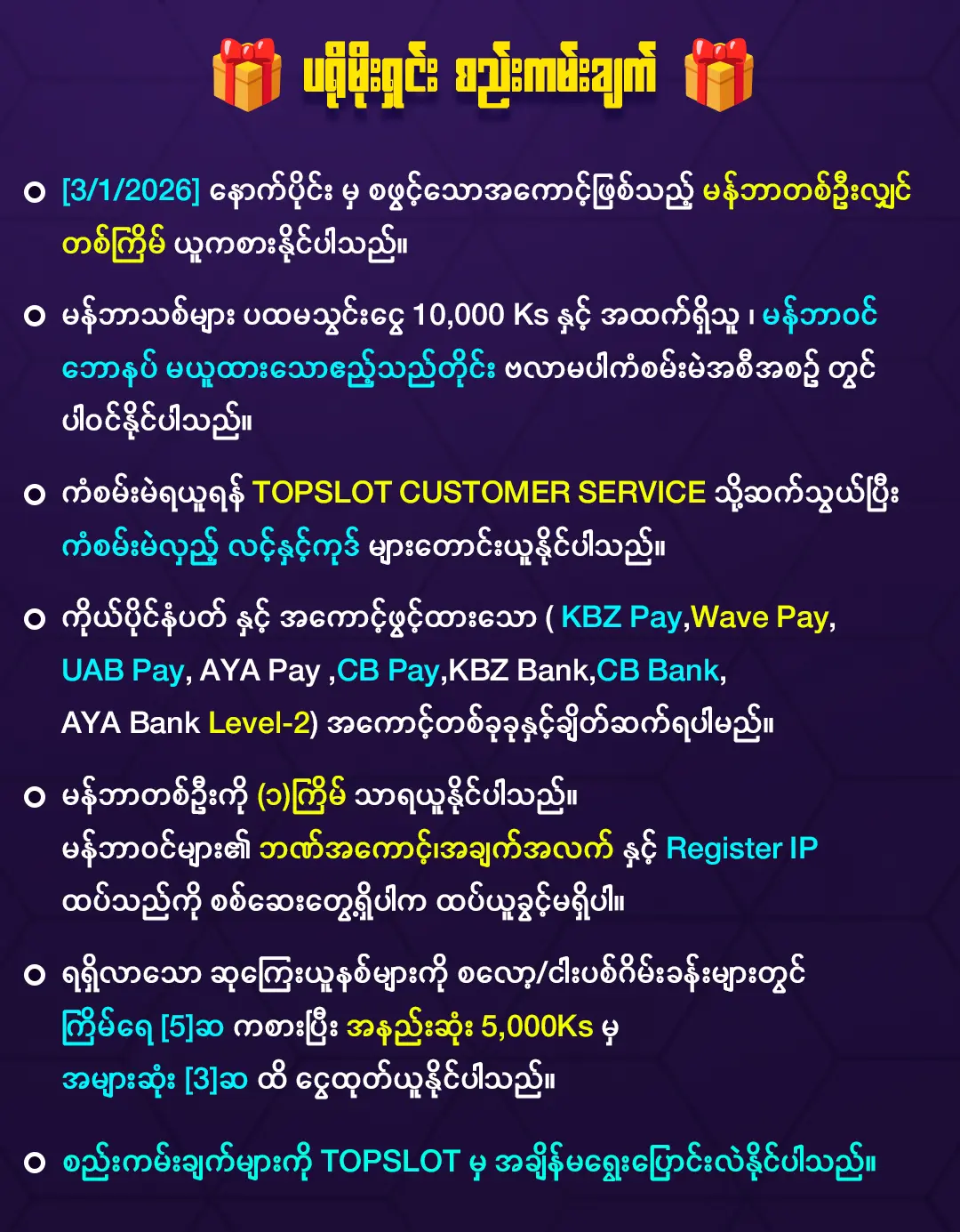 5. TOPSLOT မွ ဤပ႐ိုမိုးရွင္းအားအခ်ိန္မေ႐ြး ျပဳျပင္ေျပာင္းလဲပိုင္ခြင့္ရွိသည္။